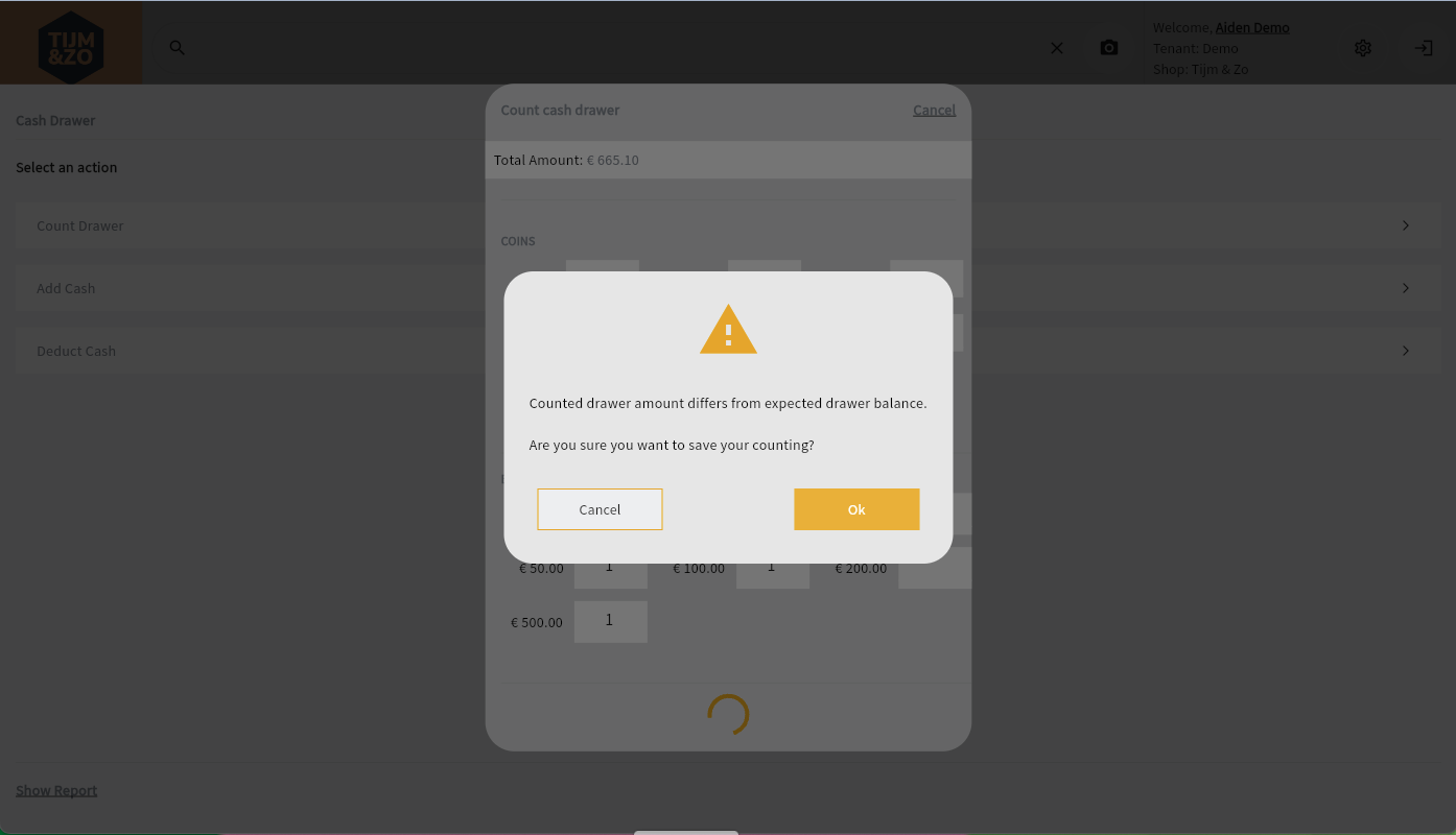 Note: if the user is authorized for the permission “CashProceduresShowCountDifference”, the actual difference between the counted amount and the expected amount is shown in the warning.