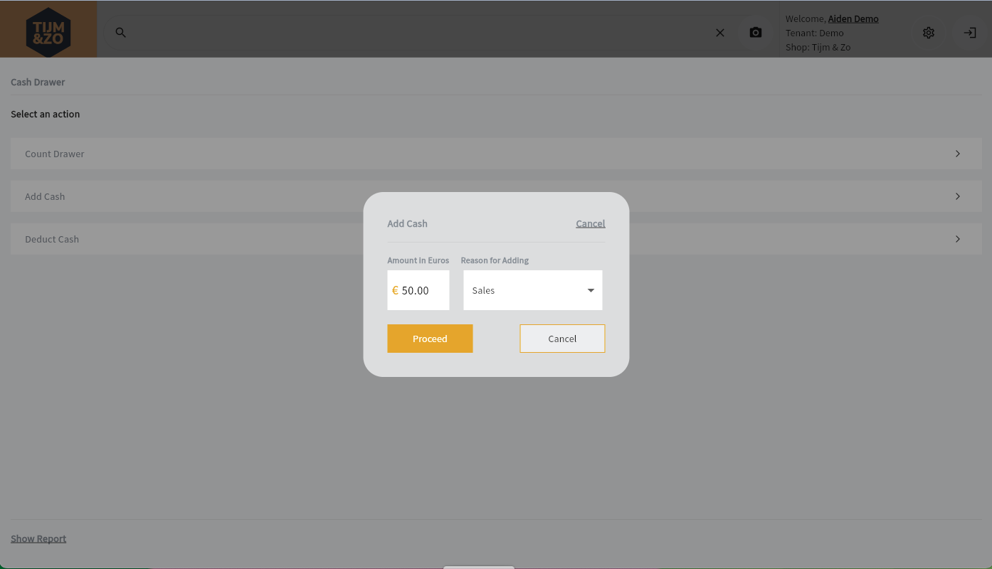 When clicking Add Cash a dialog will be shown which enables you to add a manual cash booking to the drawer. Input will follow the input in cents' setting from Store Settings and a Reason for Adding is mandatory. After pressing save, the cash booking will be saved and you will be taken back to the main Cash Procedures screen (Figure 2).