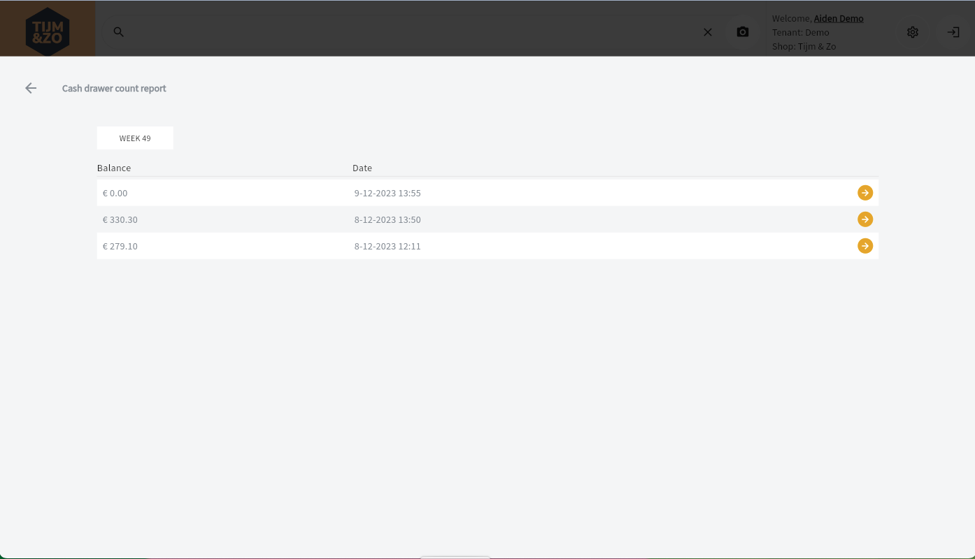 When clicking the show report link on the bottom of the main Cash Procedures Screen (see Figure 2), you will be presented an overview of all cash drawer counts, grouped by week. When clicking on the arrow button on the right side of each line, you will be navigated to a new page showing all cash bookings that have contributed to the selected cash count.