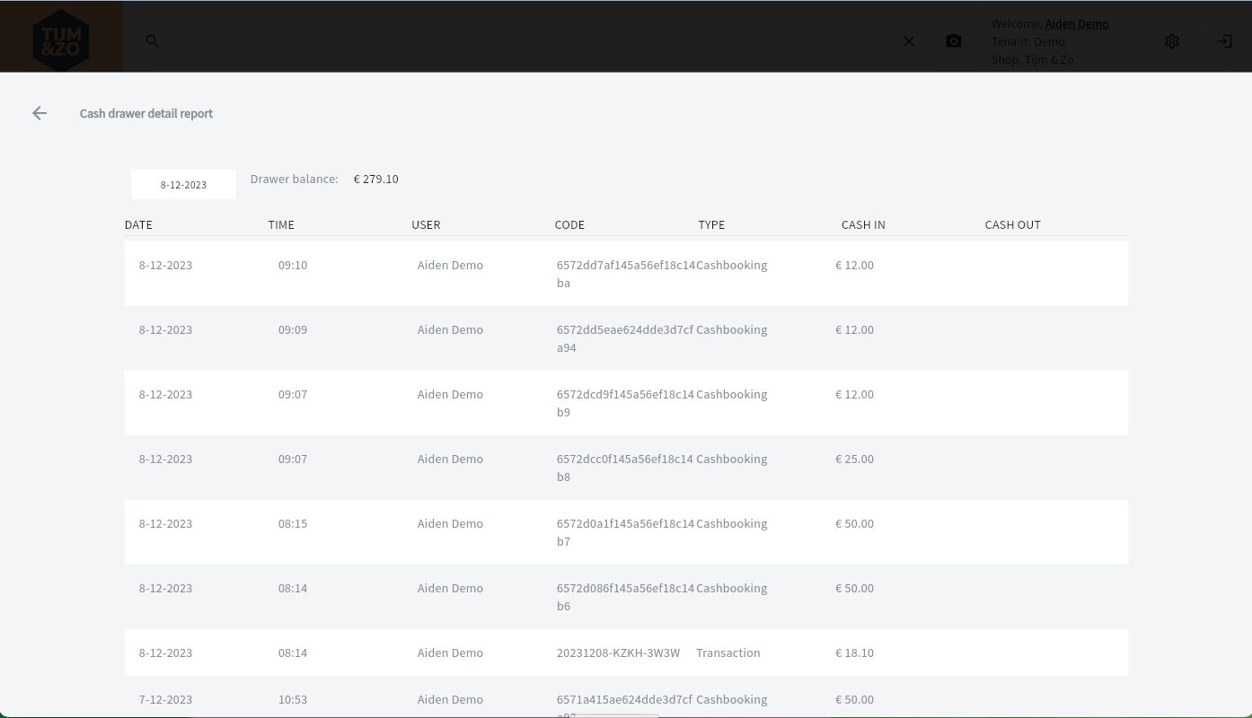 After selecting a cash count, a new page will be presented, showing all cash bookings from the latest cash count, until the current cash count. Thus showing all cash counts that have contributed to the current cash count.