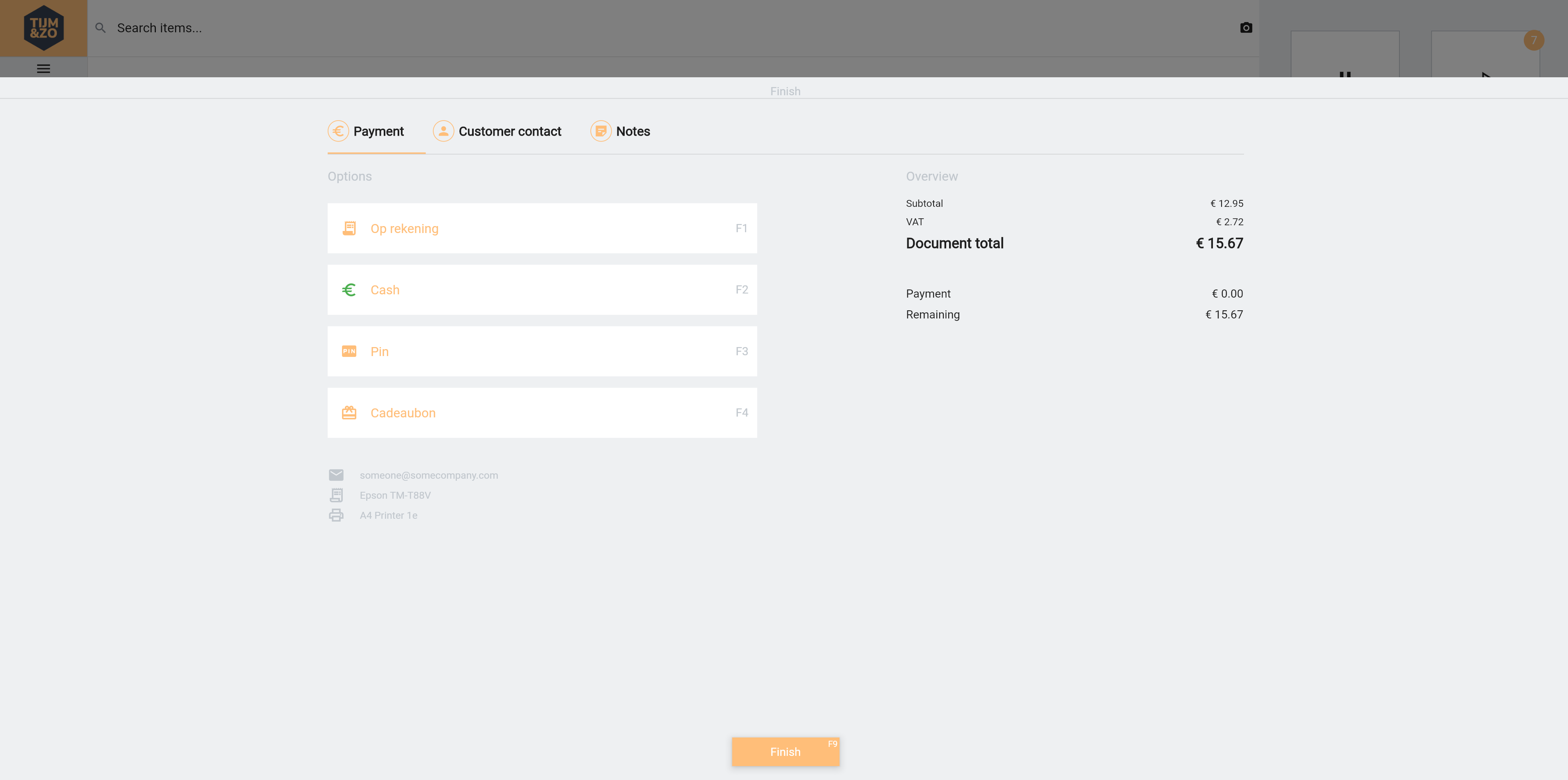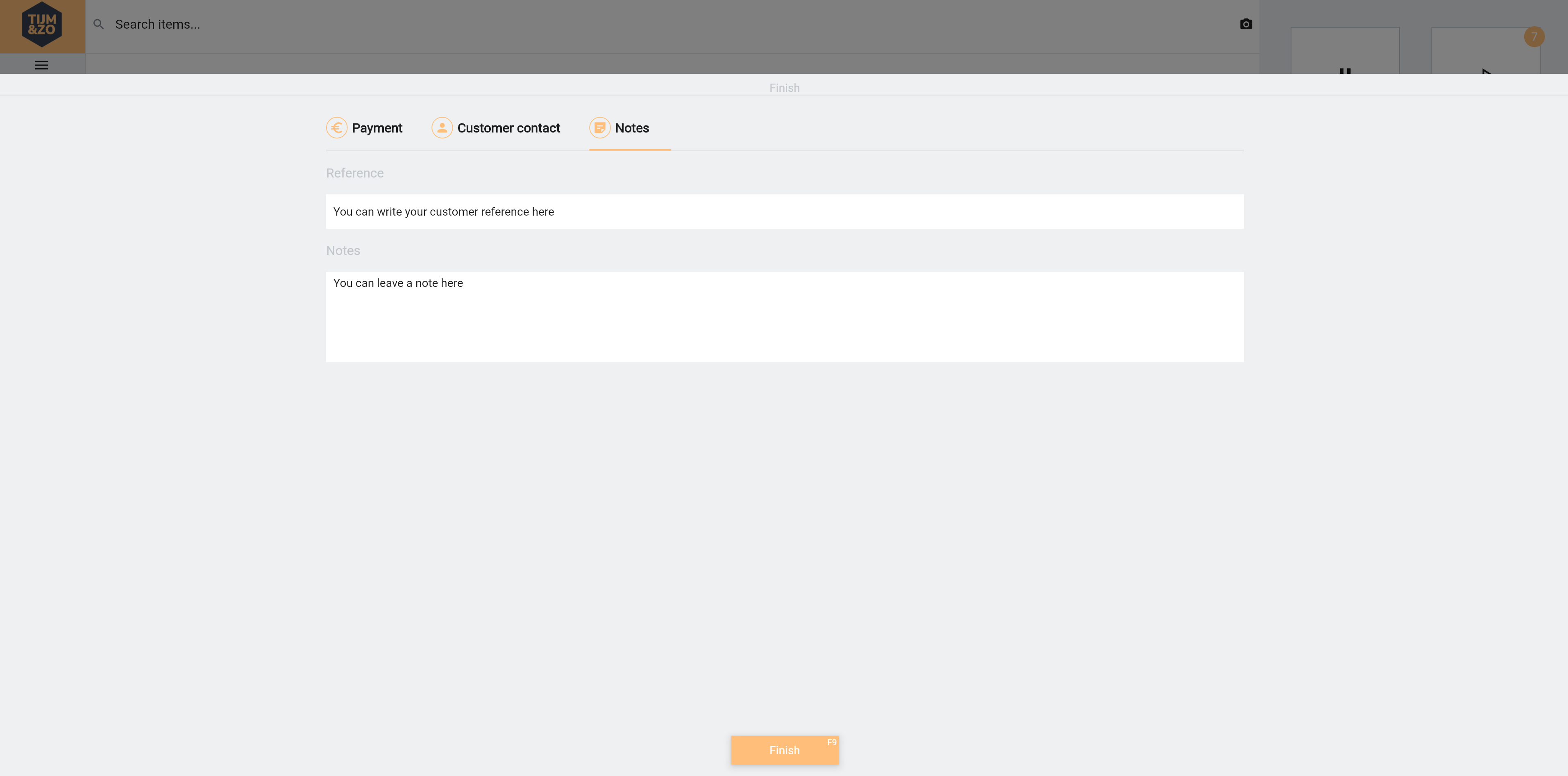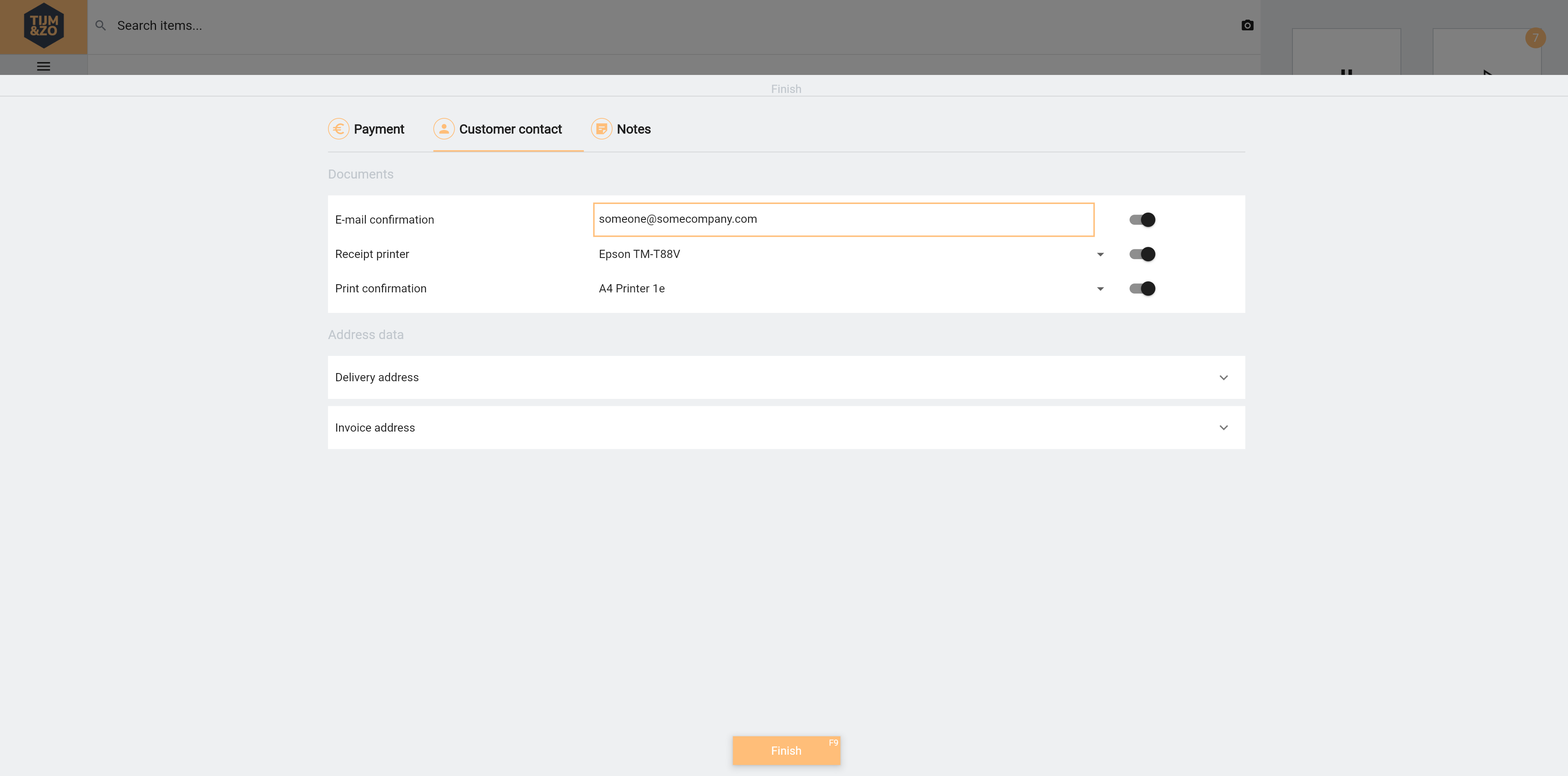The finish page consists of three tab pages, Payment, Customer contact and Notes.