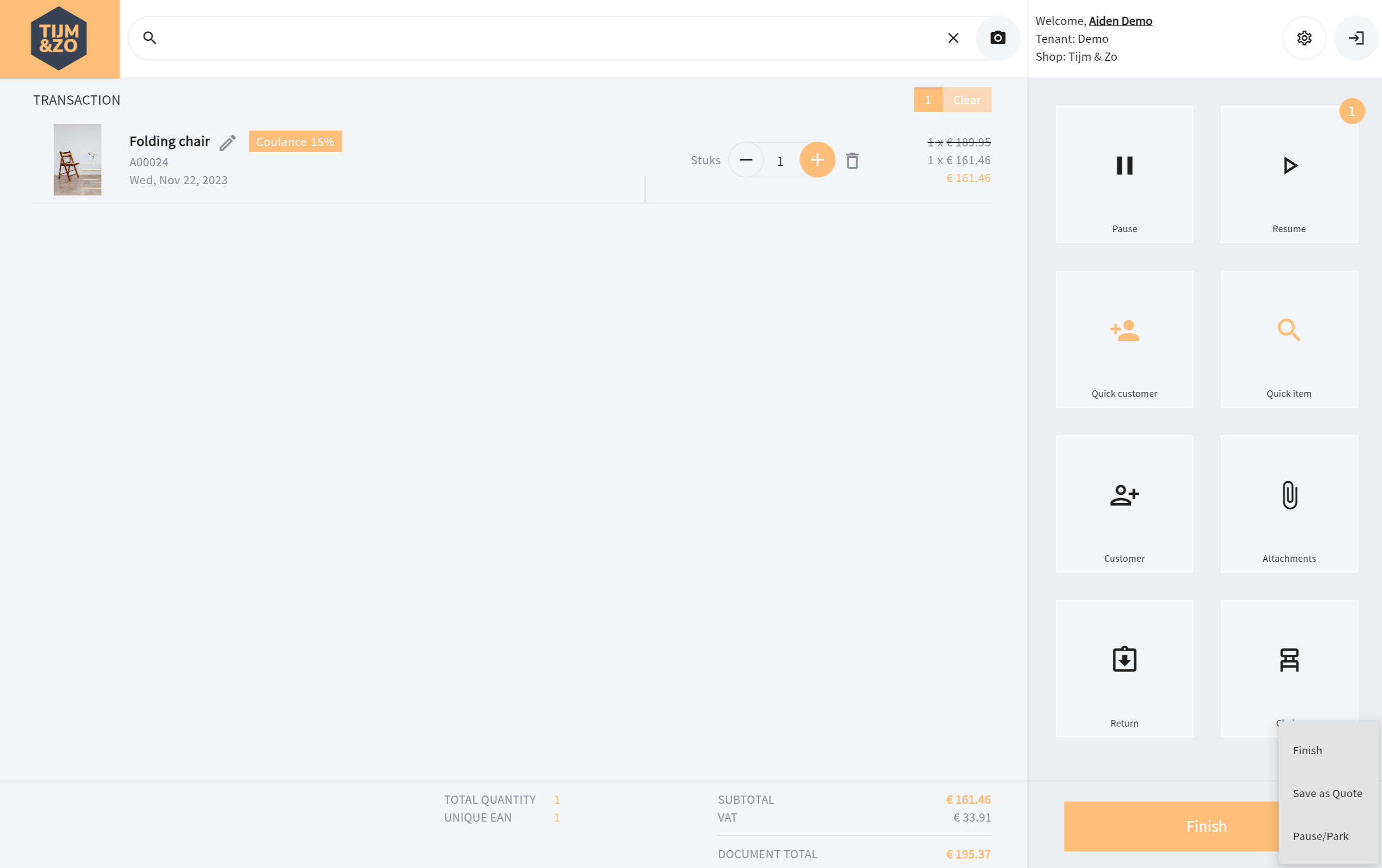 If one or more items have been added to the current transaction, a finish button will appear at the bottom of the screen. This is a multi-function button. By pressing the little down icon on the bottom right of the button itself you can see available options (Finish (default), Save as Quote, Pause/Park). When clicking the general finalize button the default action will be executed i.e. showing the finalize screen with payment options (Finish). See also figure 1.