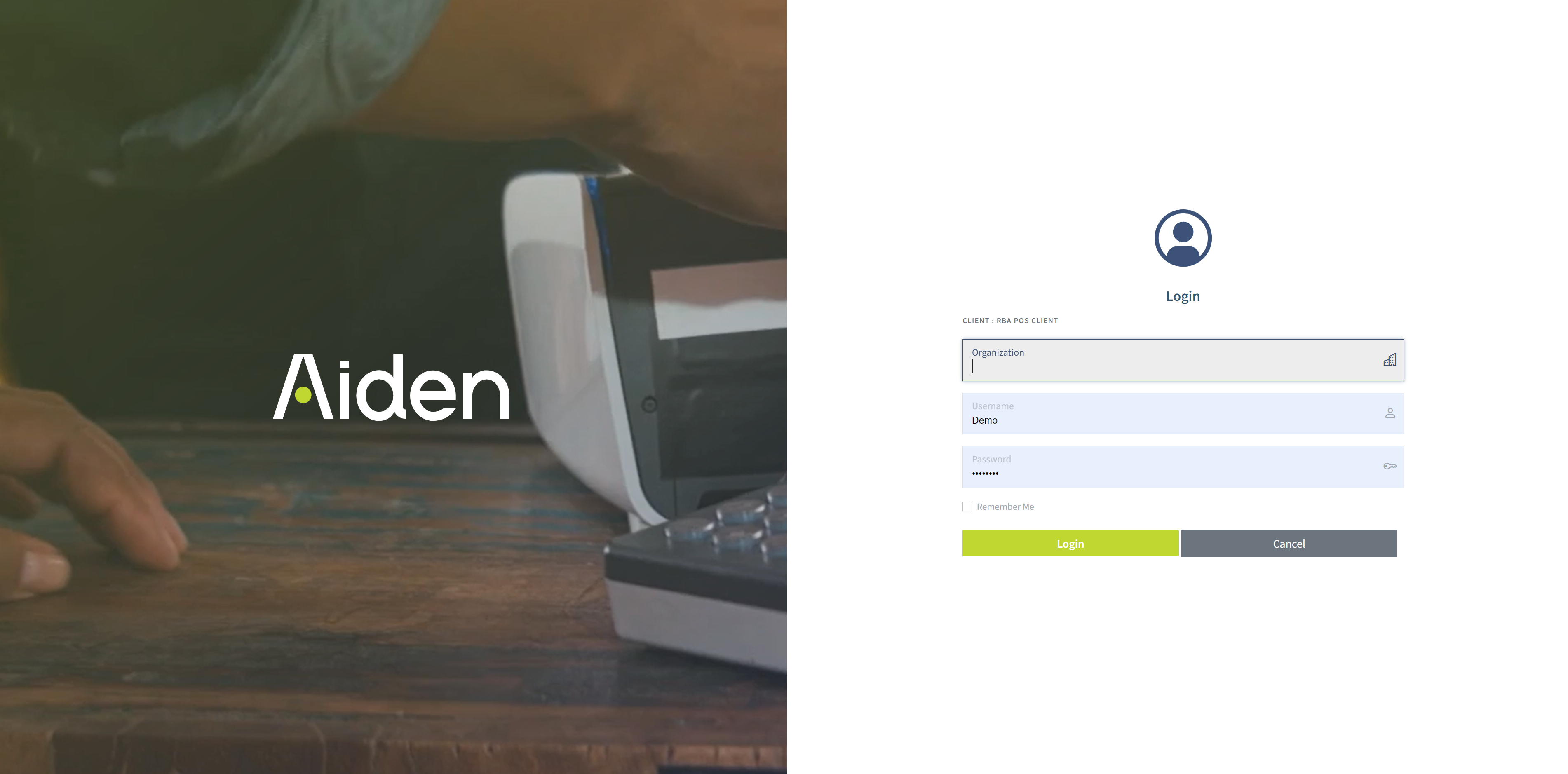 You can now log into an Aiden application. In this case; Aiden POS. You can check what application you are logging in by looking at the small grey text above organization input field: