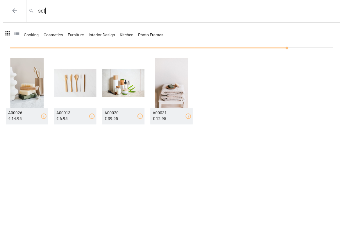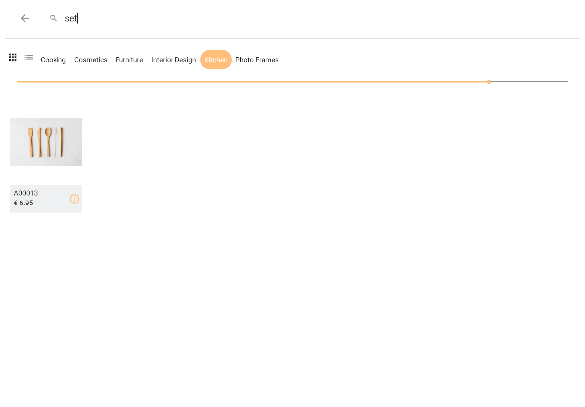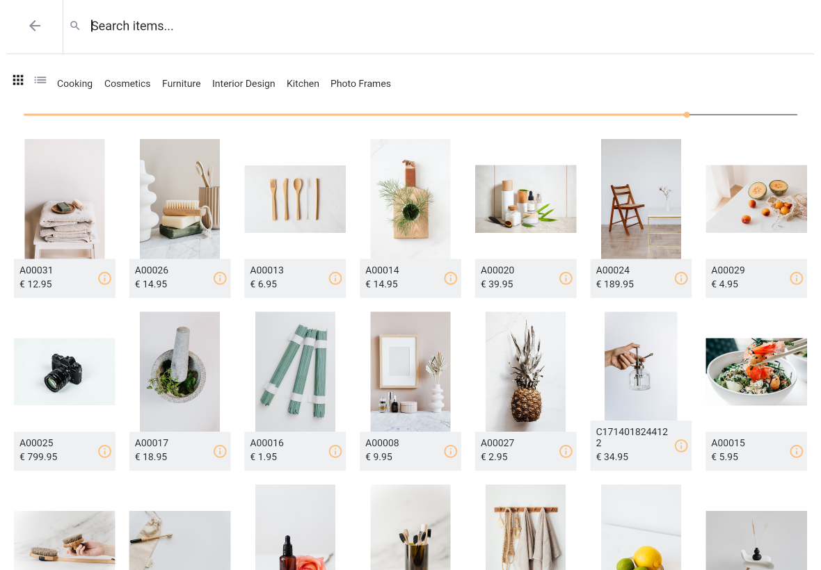 If you have chosen to set current view to grid view a slider is shown. When selecting list view this slider is not shown. Using the slider you can determine the item tile size i.e. how many tiles are shown per row. By default the application determines how many tiles are shown in grid view mode. Slider position is not saved and reset every time you (re)open the item select page.