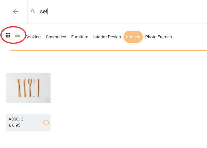 You can switch between items list view or grid view by pressing the appropriate button on the top left, just below the arrow left icon. List view or grid view is stored locally and will be remembered between different POS sessions. See figure 5.