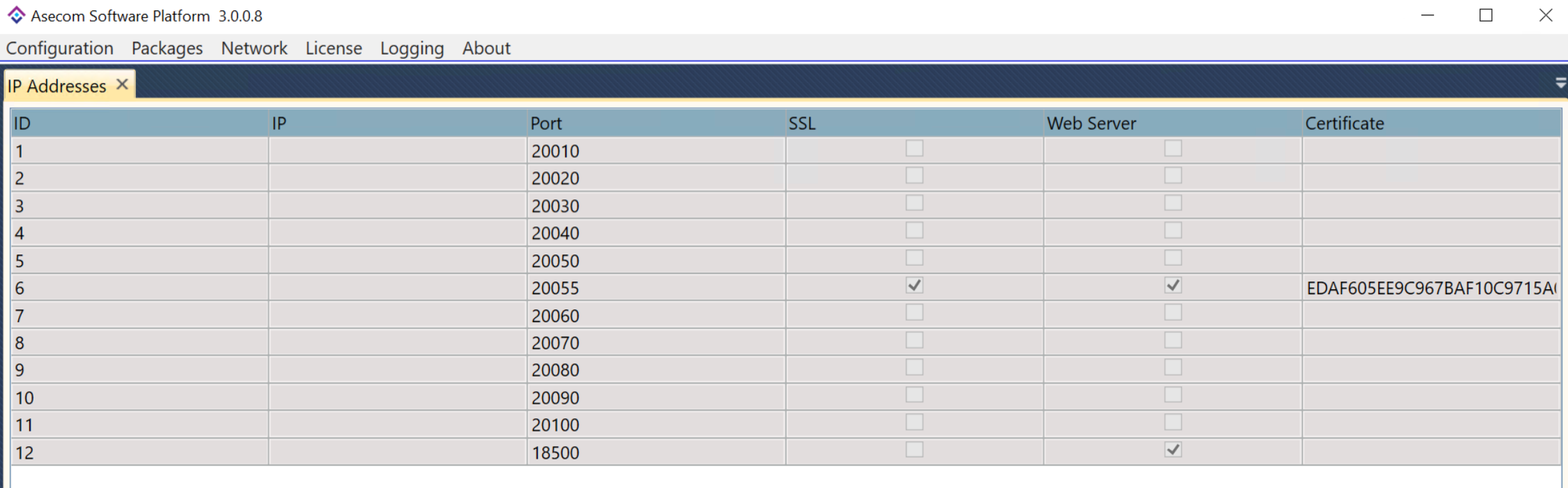 | 7 | When SSL security is required, it is possible to link an installed certificate after adding the port. Highlight the port and click the "SSL Certificate" button to select the certificate. When selected the certificate's serial number is visible in Certificate column. ![]() |