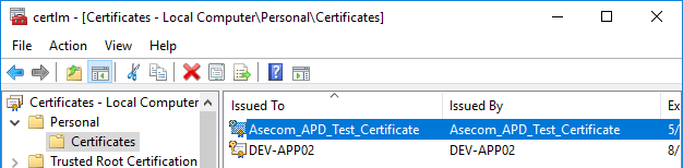 Make sure to install certificates in Personal certificate store for Local Computer. Also make sure that the certificate is complete with the private key. This is indicated by it's icon, which should display a key (see image below). ![]() |