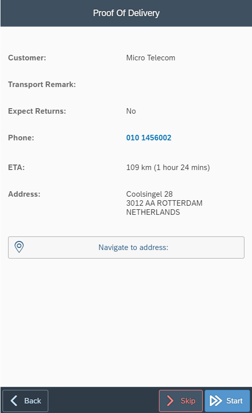 If for some reason the customer cannot be contacted or cannot be reached due to traffic, the stop can be skipped by using the Skip button.