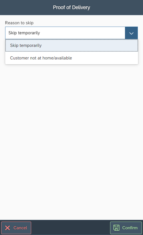 Customer not at home/available The address will be skipped completely. Status of documents will be changed to "NotHome" in Proof of Delivery Monitor.