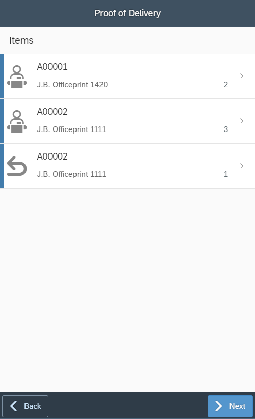 When the Start button was pressed, a list of items to be delivered or returned is presented.