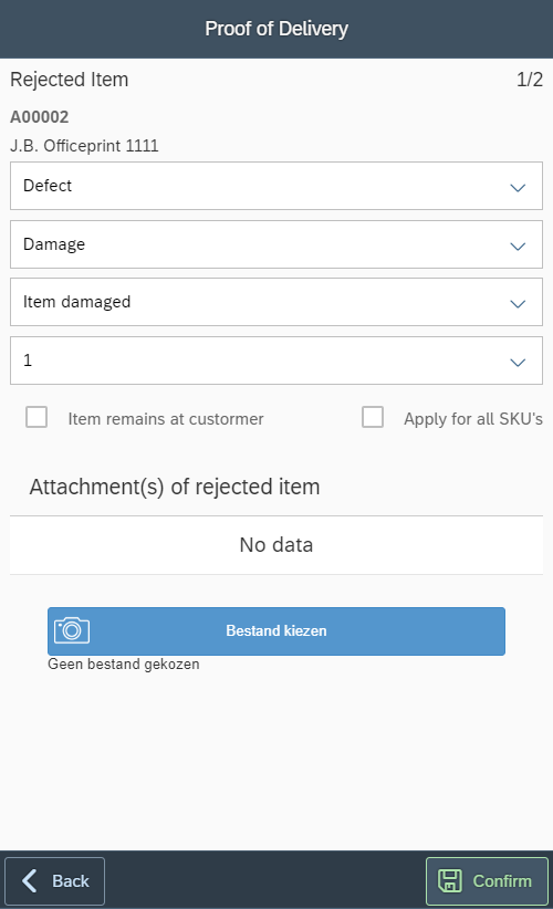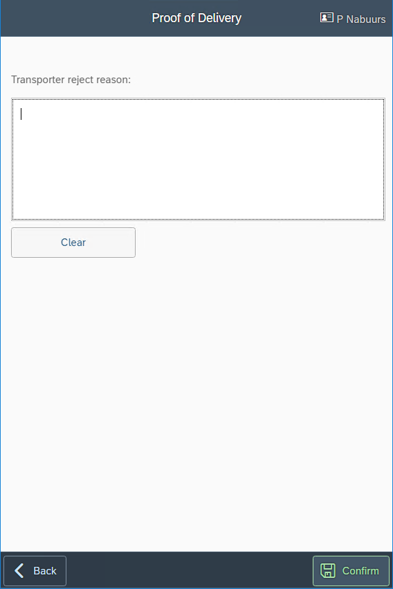 If one or more items are rejected by customer and the Reject Reason box in menu Proof of Delivery Monitor > Config > Functional Settings > Overview is checked, there will be a remark field for the Transporter to fill in reject reason(s) for all rejected items.