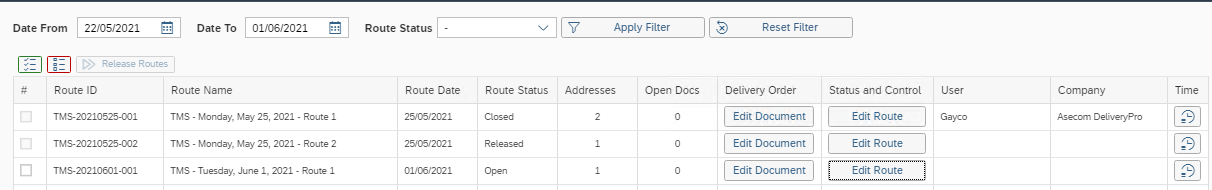 The Release Route button is only active on routes with status Open.