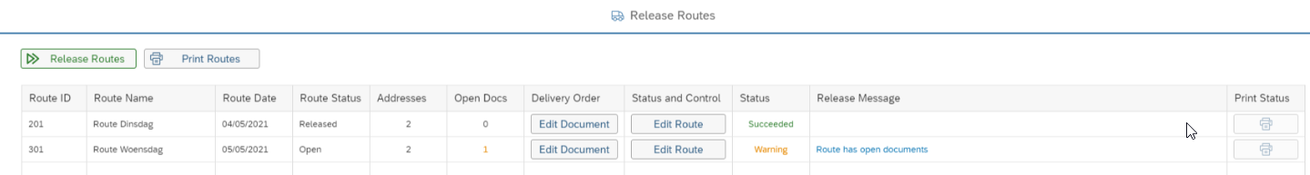 By default, routes can be only released when (WarehousePro) Picking is complete. Open documents in a route are visible on the Release Routes screen and the status changes to Warning when releasing Routes with open documents.