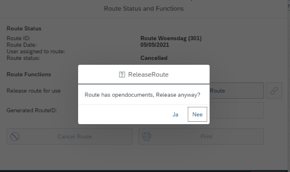 Routes with open documents can still be processed by selecting Ja on the message screen.