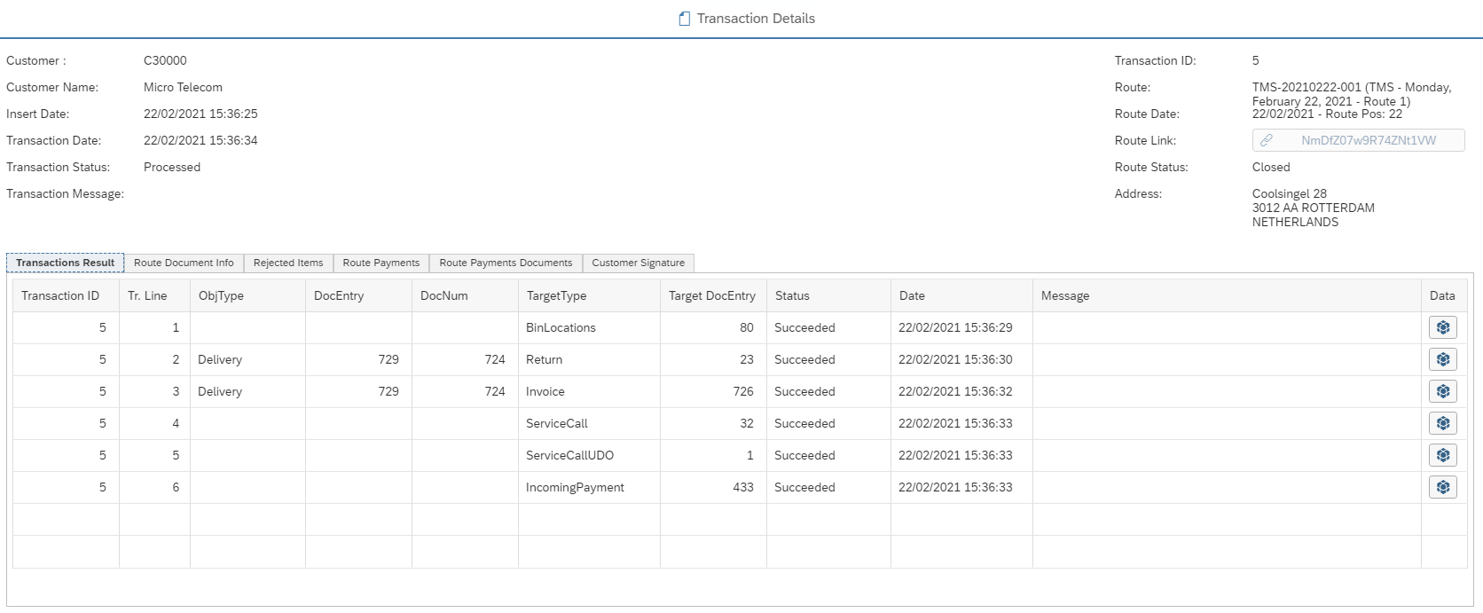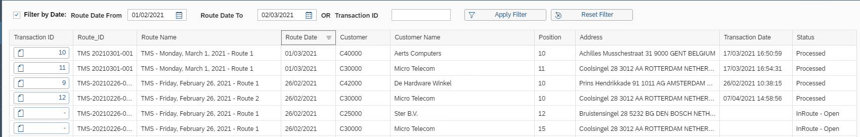 Click on the button in the Transaction ID column to check details of the transaction. When a stop is still In Route there's no Transaction ID visible in the button.