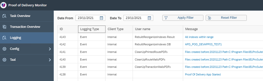 The Logging tab displays all events processed by Proof of Delivery App.
