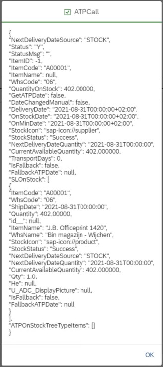 Use the Test ATP Call function to validate if data returns correctly. The result has the structure as mentioned below.