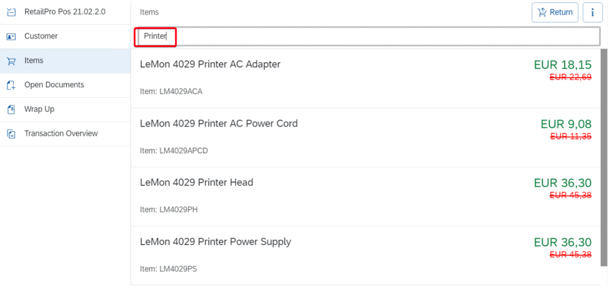 When in the menu Items you are able to select Item(s) for processing. The search function uses catch words. For example: when entering the word "printer" you will see all items that contain the text. Select the item from the list.