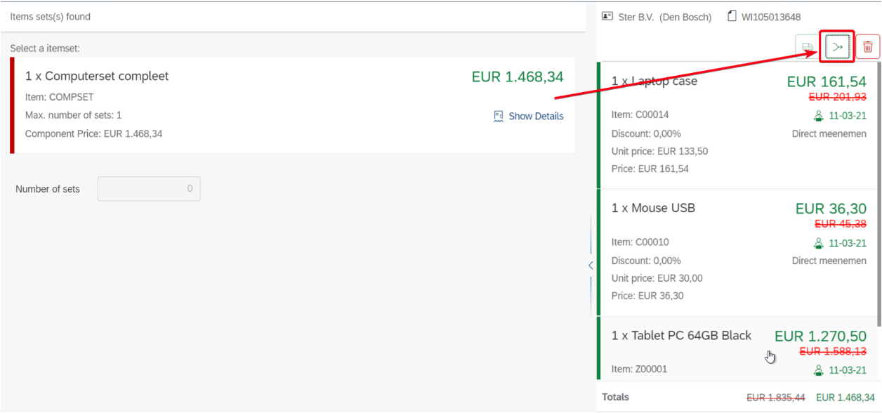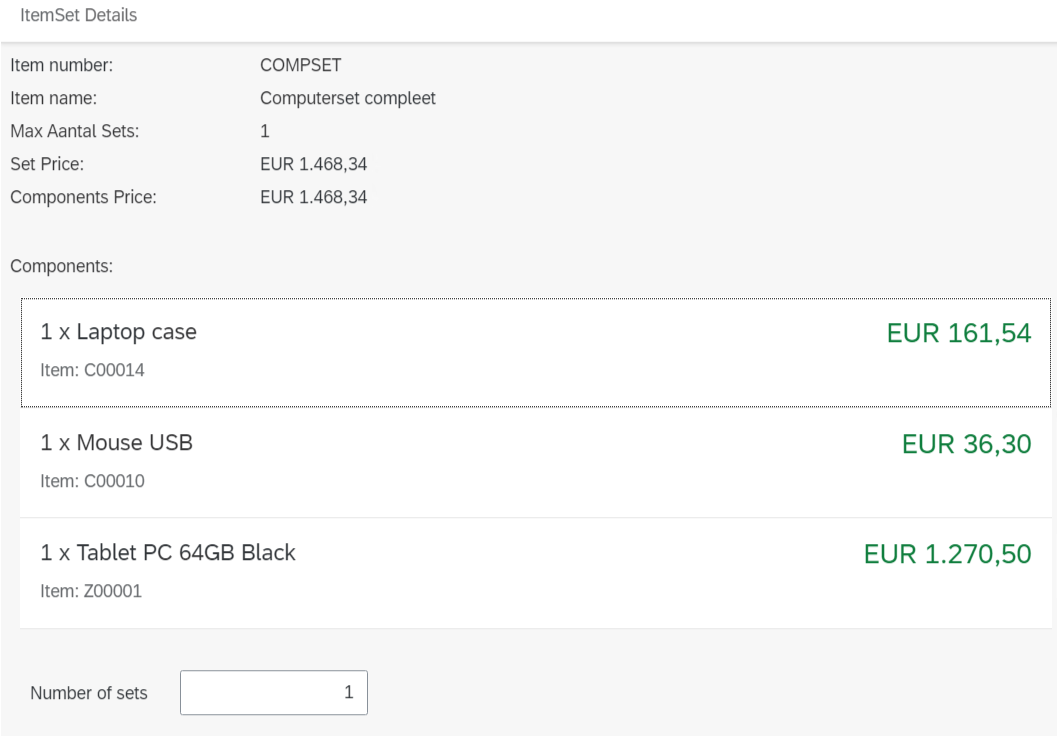 When you enter components from a BOM item, a green frame will be visible around the combinations button. When you click this button, the itemset will be visible.