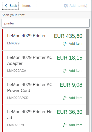 After customer identification the app will be waiting for item search requests. Although the focus is on Barcode scanning, the search function uses catch words. For example: when entering the word "printer" you will see all items that contain the text. Select the item from the list.