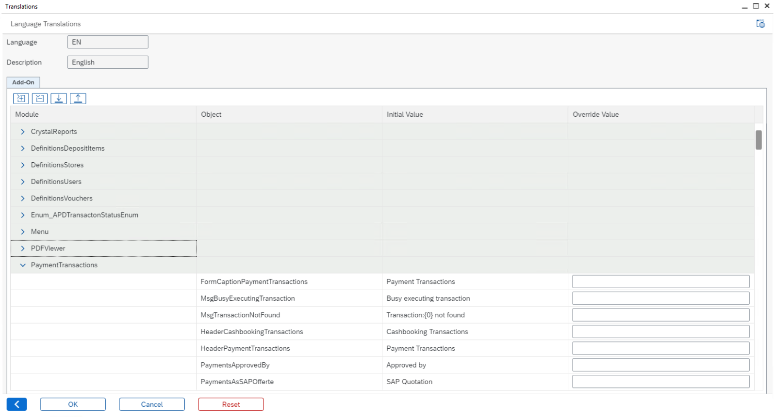 In this setting it is possible to configure the description of most text objects (definitions, messages and screens) in the Add-On.