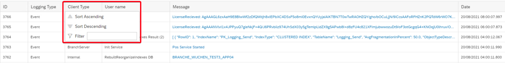 It is also possible to filter on other columns (ID, Cliƫnt Type, User name, Message, Date).
