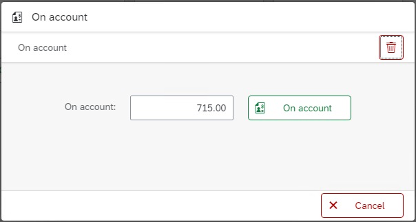 When adding "On Account" payments, simply edit the amount to be paid. By default, the field is prefilled with the Downpayment amount or the total remaining amount to pay.