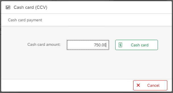 When adding "Cash Card (CCV)" or "Credit Card (CCV)" payments, simply edit the amount to be paid. By default, the field is prefilled with the Downpayment amount or the total remaining amount to pay.