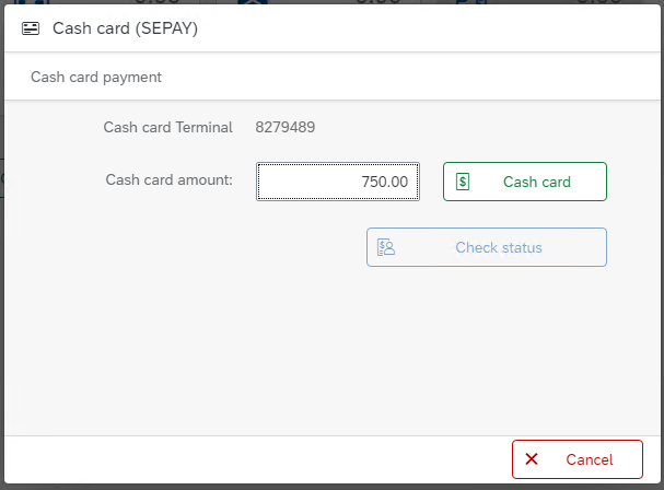 After changing the amount, make sure to click or press the "Cash Card" button. At that point the SEPAY Cash Card Payment Device is contacted via the set up SEPAY webservice. The SEPAY webservice will return a confirmation when the device was successfully contacted. After receiving this confirmation, a signal will be send to the local card payment device to initialize the payment (amount to pay is displayed on the device).