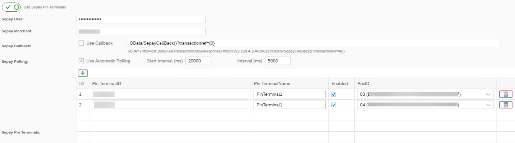 Sepay Polling: Mark the checkbox in order to activate polling (instead of callback) . The software itself checks at a fixed interval (ms) whether new data can be read or written on the Pin terminal.