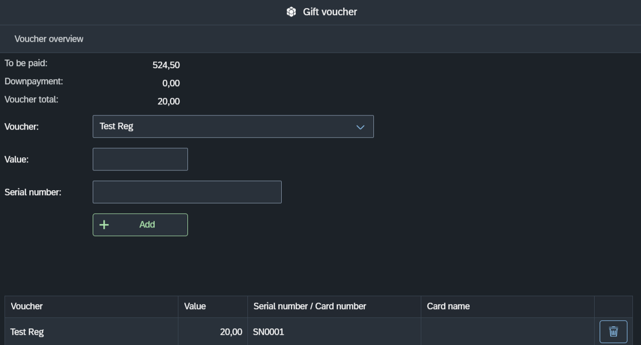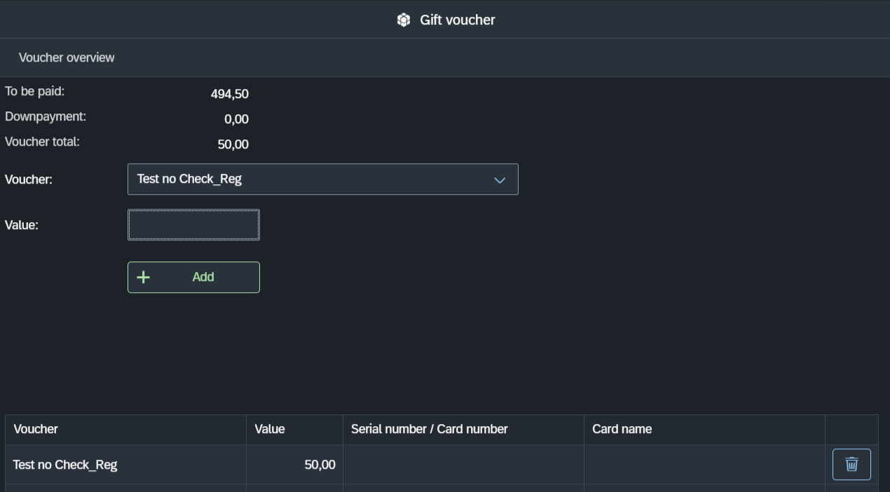 If Check serialnumber and Registration are not check marked, it is possible to process vouchers manually. In this case, only the value of the voucher needs to be filled in. the Point of Sale.
