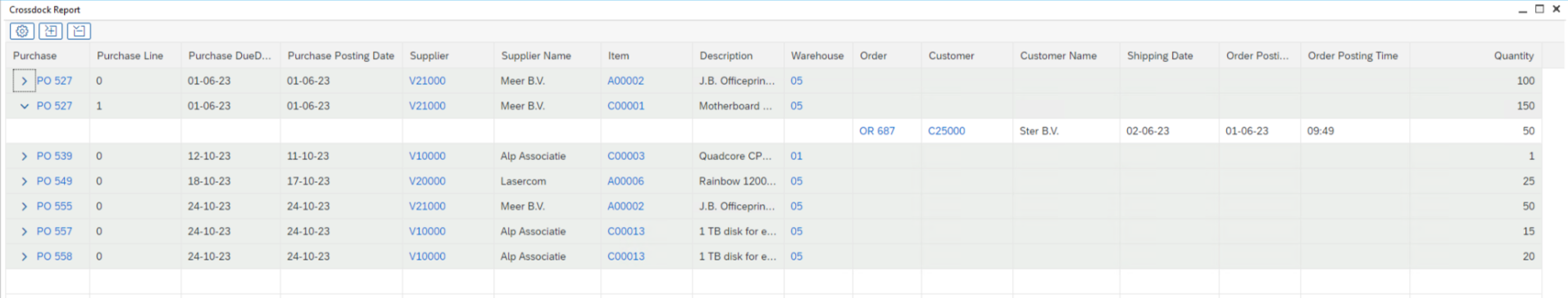 The cross-dock process is activated when a relationship has been established between the acquisition document and the customer order based on a (WarehousePro) allocation.
