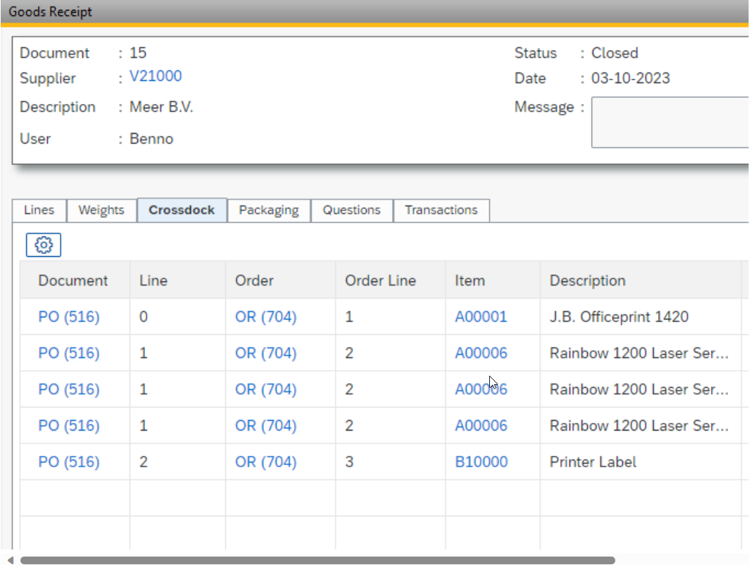 In goods receipt screen a tab Crossdock has been added. This is also shown in the generated picklist.