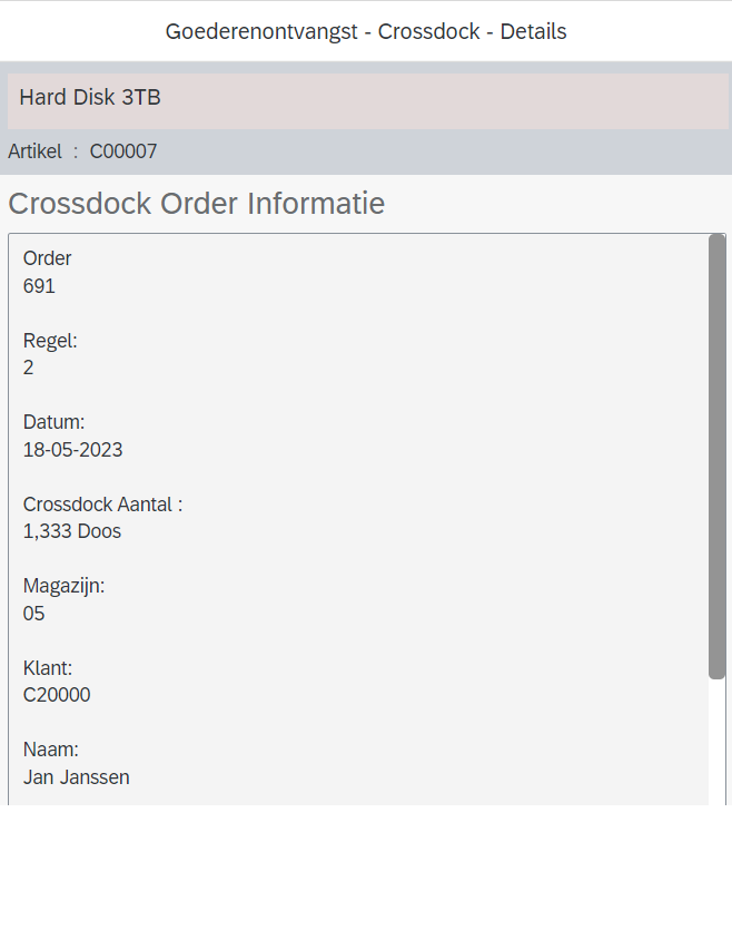 After selecting the line with crossdock you will arrive at the "crossdock order information" screen.
