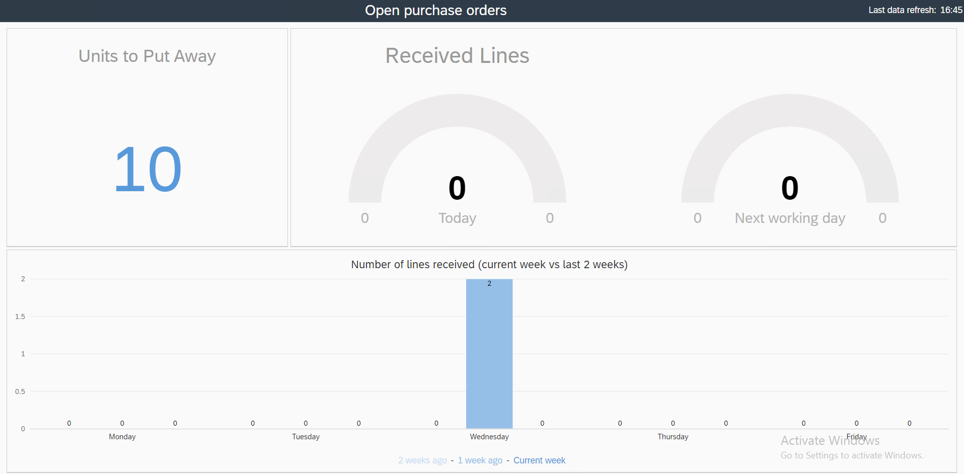 This dashboard shows current information about the progress in the warehouse with regard to receiving new stock via purchase orders. The time of the last data refresh is displayed in the top right corner.