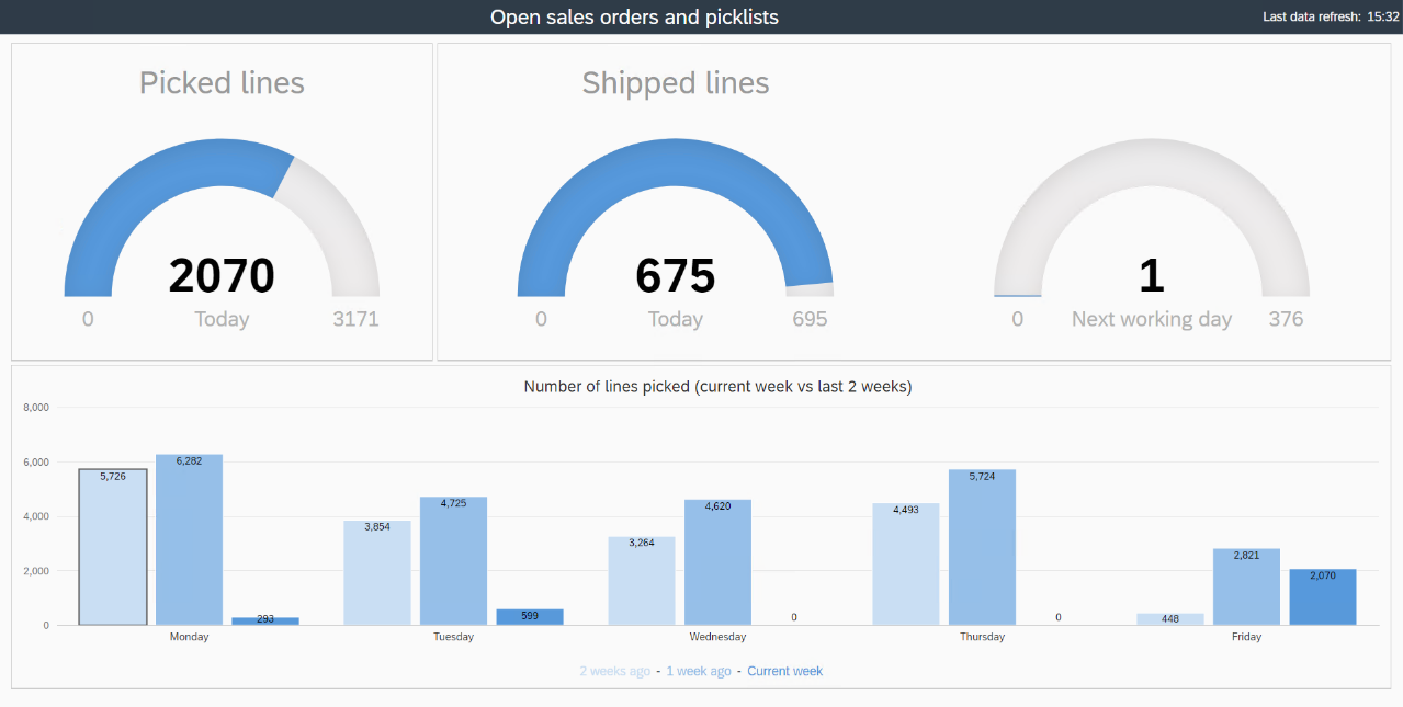 This dashboard shows current information about the progress in the warehouse regarding the delivery of sales orders. The time of the last data refresh is displayed in the top right corner.