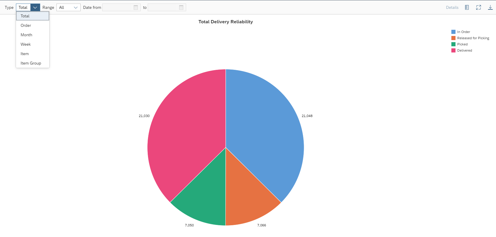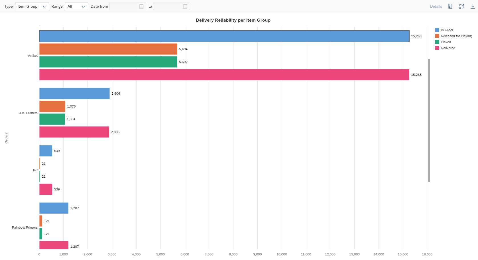 This report shows in various display options the delivery reliability of orders. The number of order lines is compared to the numbers supplied and between them the number to be picked and the numbers that have already been picked. You can filter on a specific period and group on a desired angle.
