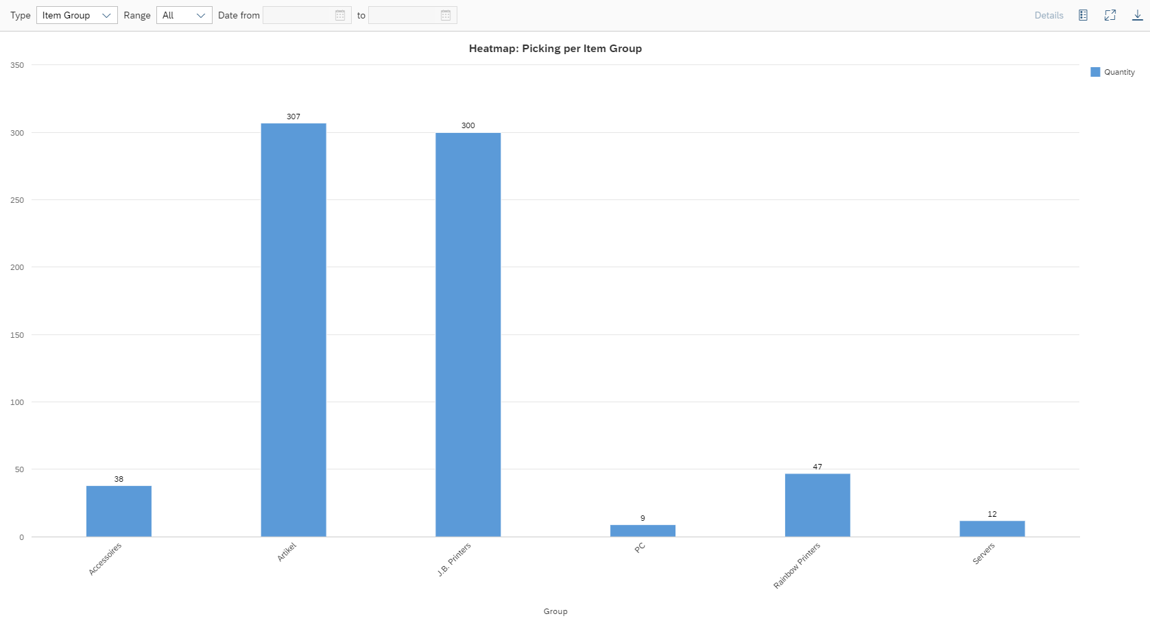 Also for items (or grouped by article group) an overview can be generated of most touched items. Again for the Production / Order Picking, Put Away or Stock Transfer functions.