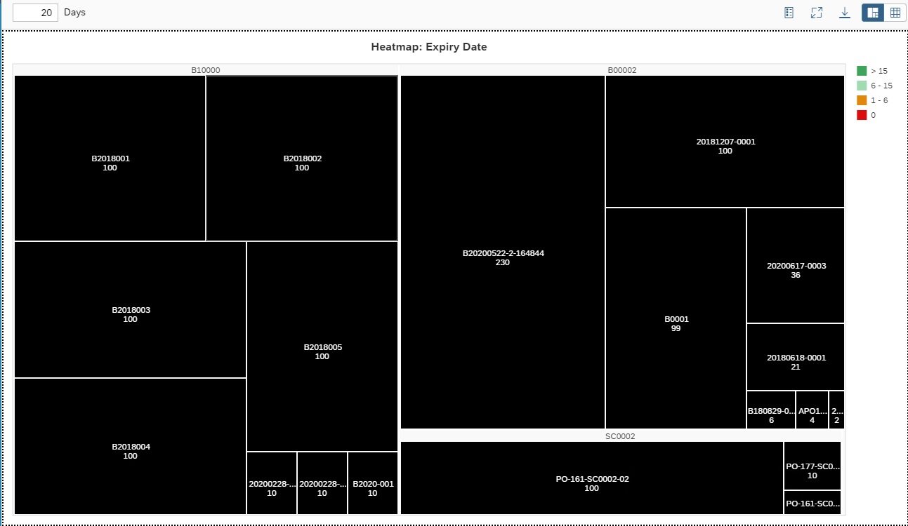 The example above shows the batches with stock per item that are likely to expire within 15 days. Or have already expired (red).