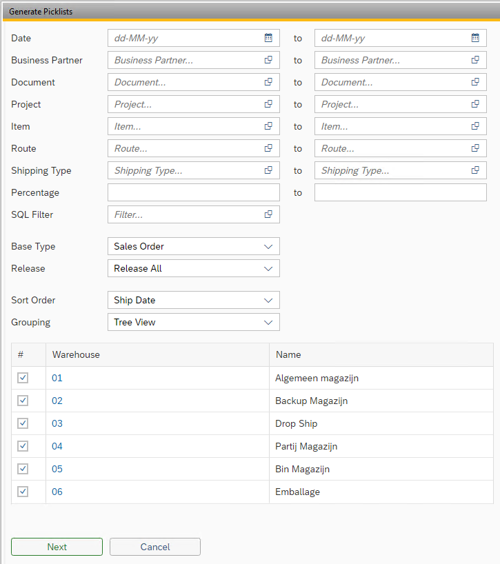 A more advanced way to generate pick lists is via the Generate Pick Lists screen. This is a manual method with which Filters can be used to make a selection of documents or lines of documents. This selection can later be included in one or more pick lists.