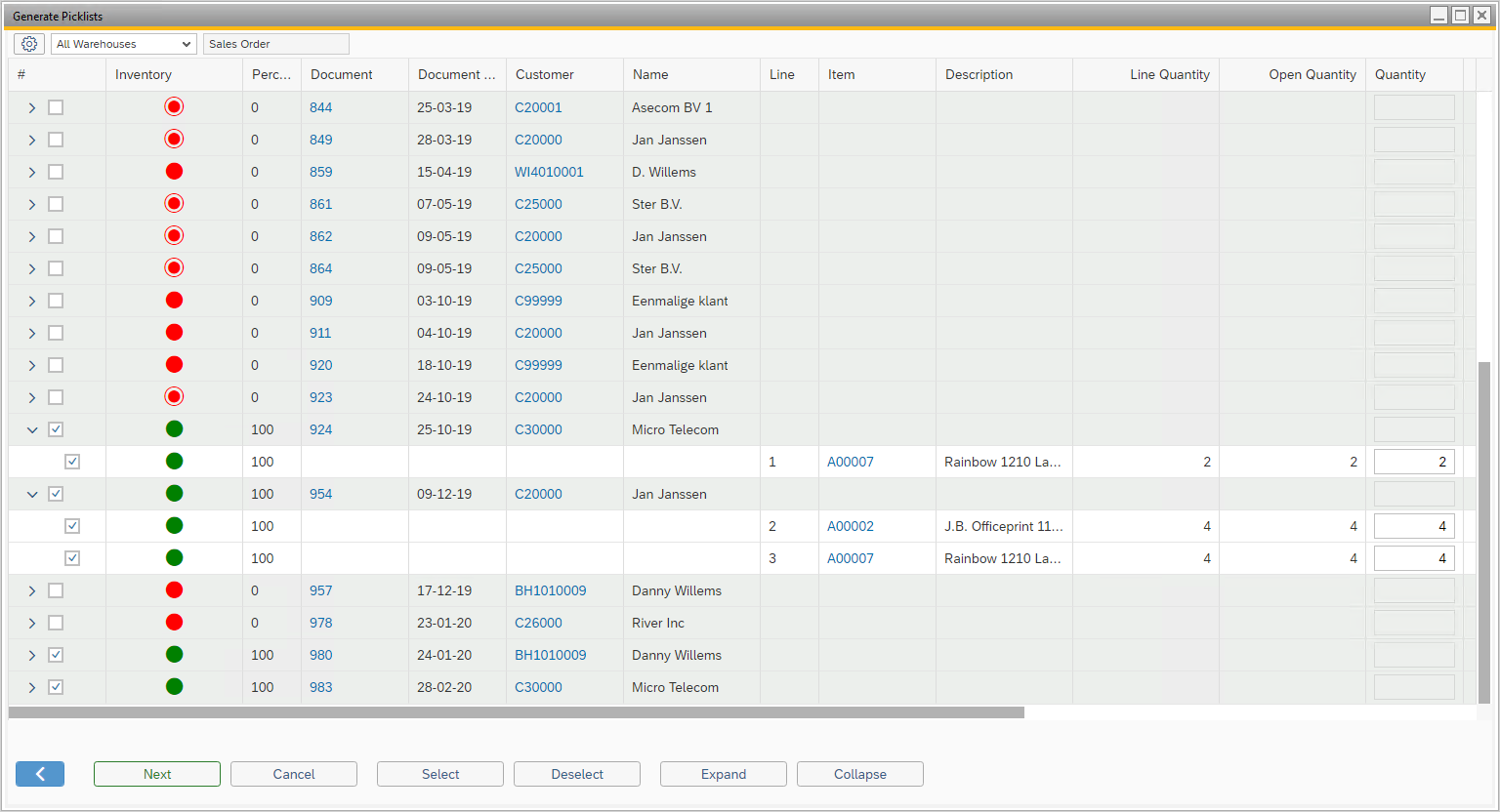 In this screen lines can then be selected (check mark in the first column) which should be included in the pick list. The Selectbutton automatically selects all available stock (again from top to bottom).By placing the check mark in front of a document, all lines belonging to that order are automatically selected. Lines marked in red are skipped if they were selected manually.