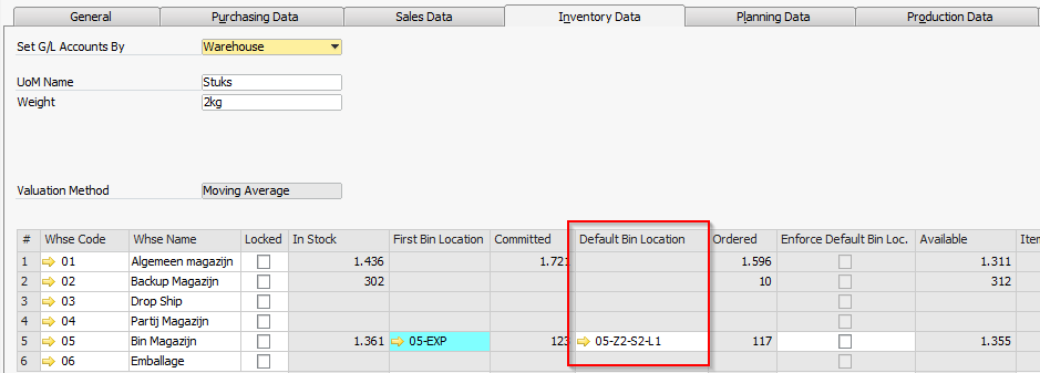 Image: Item Master Data–Default Bin Location