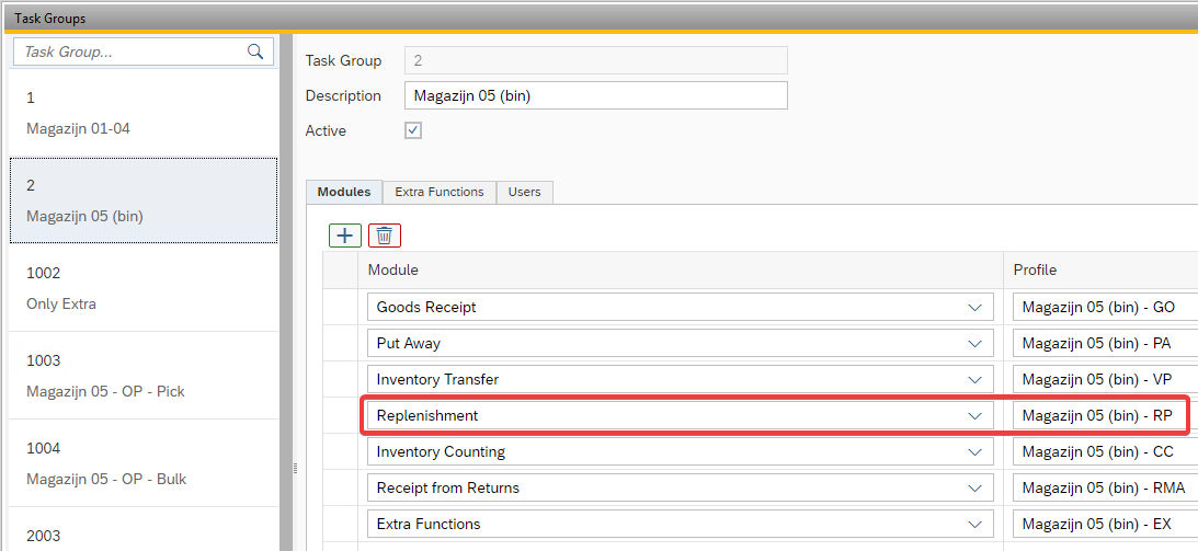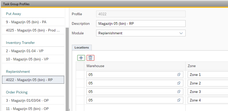 To determine which warehouse locations may be replenished by which users, Task Groups must be defined with a Task Group Profile for the application Replenishment in which it is determined which warehouses and sub levels are accessible to this group.