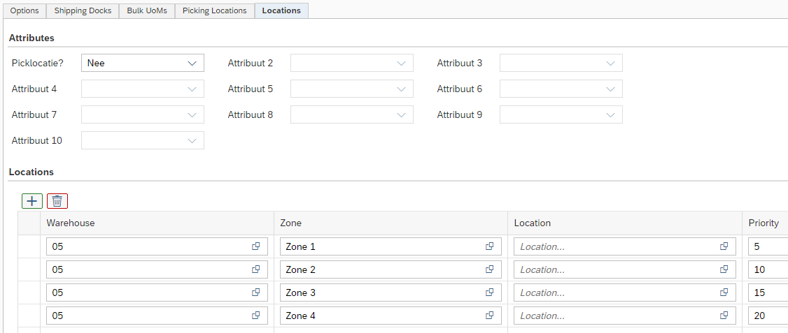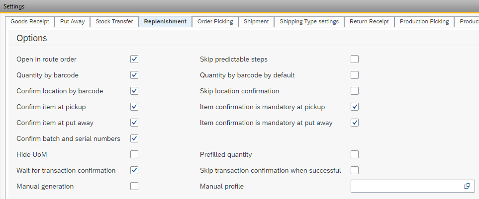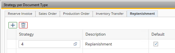 In the strategy in the Options tab, determine how the stock should be selected (such as for batch numbers, for example, by expiration date) and in the Locations tab, from which warehouse locations the stock can be selected. Bear in mind that a replenishment remains within the administrative SAP Business One warehouse. If the location to be replenished is in warehouse 05, this must also be replenished from warehouse 05.