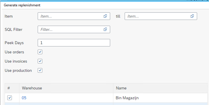 Also select for which warehouse the replenishment should be checked. Note that only bin managed warehouses can be selected.