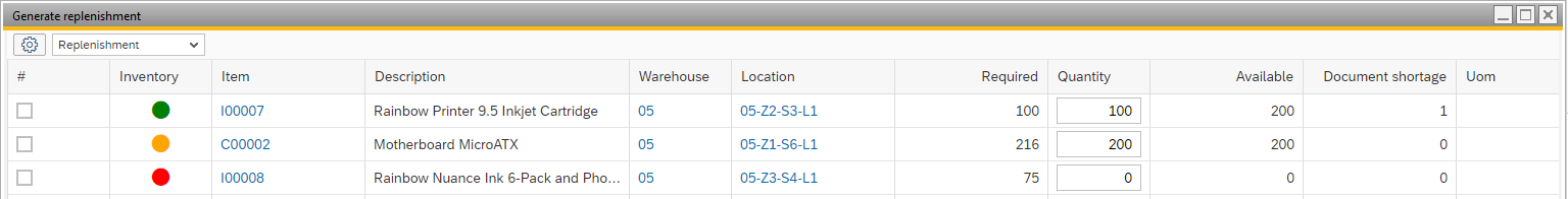 After clicking the Next button a list of items that need to be replenished is displayed.