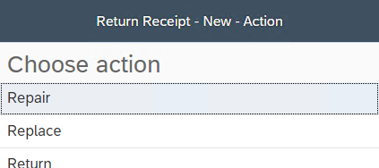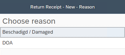 After selecting the item, the user can be asked to specify the return Reason. This depends on settings for this function. The list of reasons is maintained in SAP Business One. The same counts for Action. Here the user also must select (if enabled) the desired action from the list.