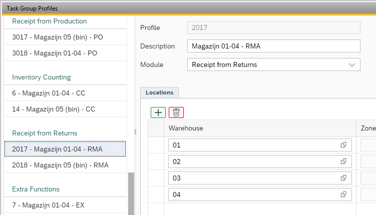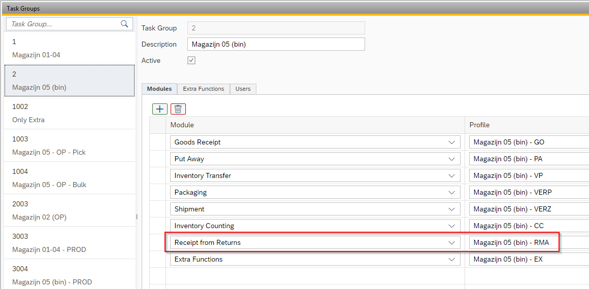 Determine for which task groups the functionality for receiving Return Requests should be made available. It is also possible to divide different warehouses over multiple task groups via task group profiles.