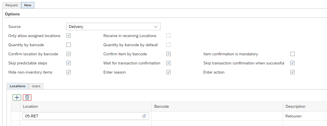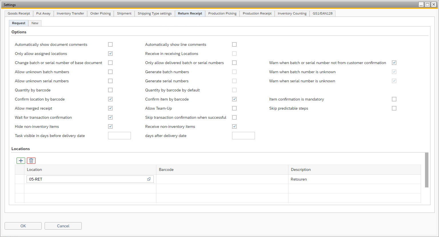 Various settings are available for the WarehousePro client function "Return Receipt". Specific settings for the receipt based on return requests and the new “ad-hoc” returns are available.