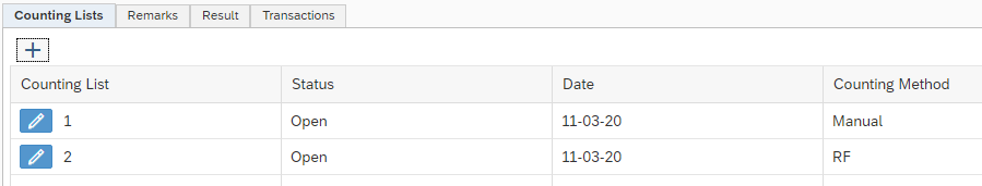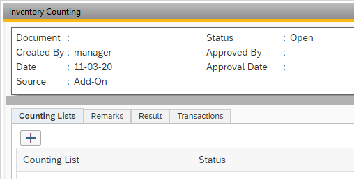 An inventory counting task can only be performed when count lists are added to it. To do this, press the "+" icon under the Counting Lists tab.